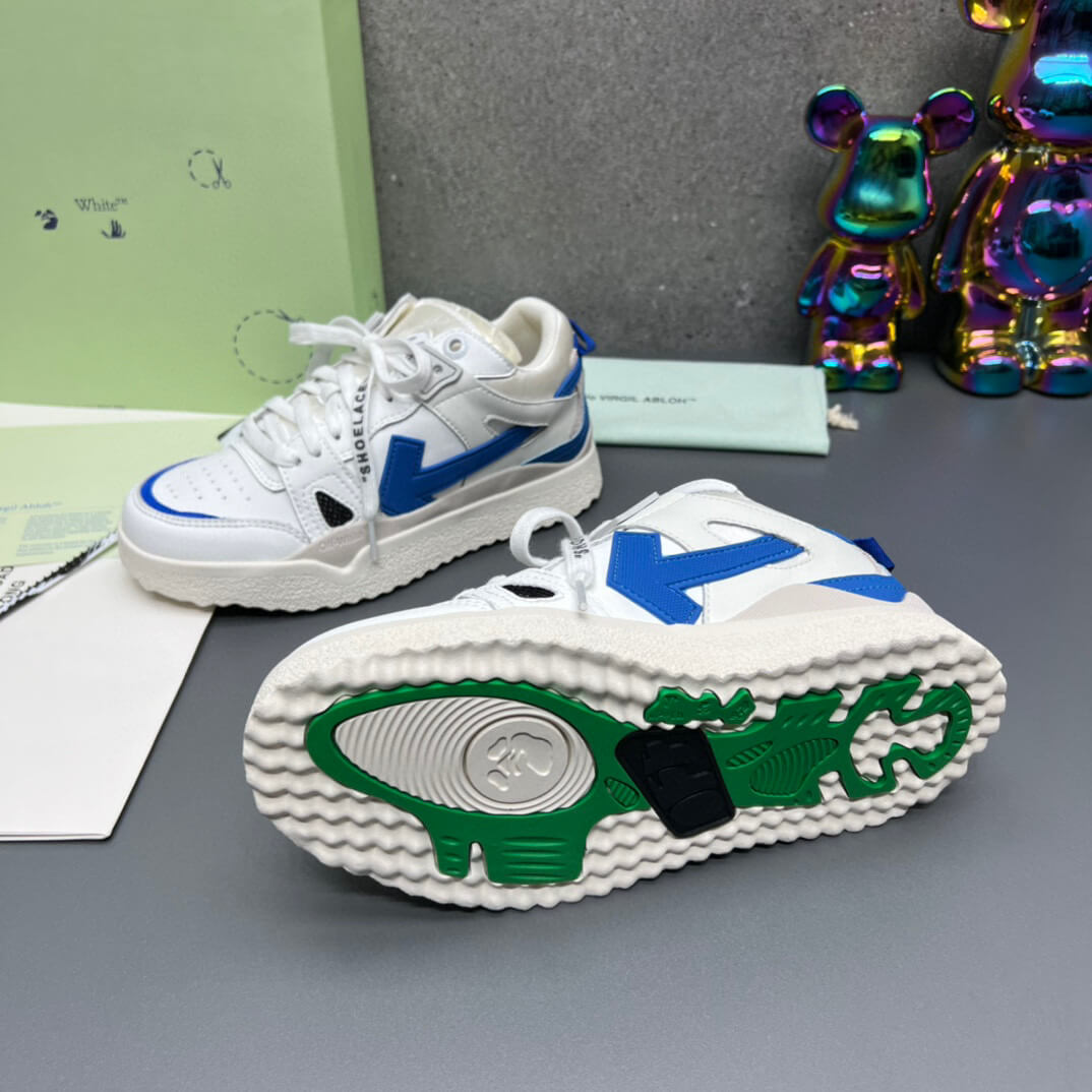 A: The Off-White 'White Blue' Sponge Mid-Top Sneaker features a slightly higher ankle collar for added support and a distinct silhouette. While the fit is true to size in length, the mid-top design provides a more secure feel around the ankle compared to a traditional low-top.
